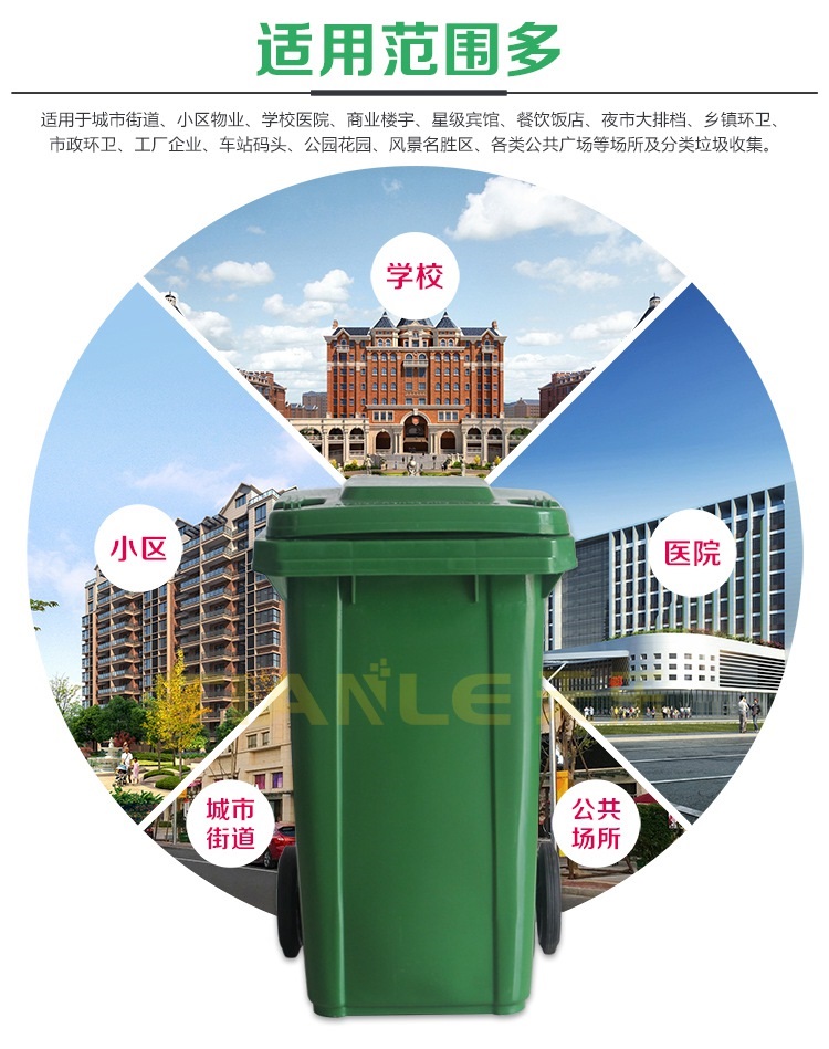 【適用場所】鄉(xiāng)鎮(zhèn)環(huán)衛(wèi)、住宅小區(qū)、學(xué)校醫(yī)院、城市街道、市政環(huán)衛(wèi)、商業(yè)樓宇、星級(jí)賓館、餐飲飯店、夜市大排檔、工廠企業(yè)、花園公園、車站碼頭、風(fēng)景名勝區(qū)、各類公共廣場等場所及分類垃圾收集。