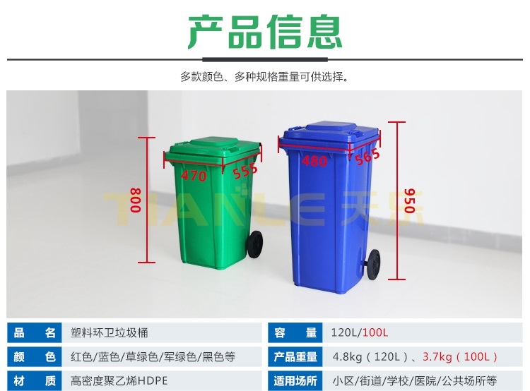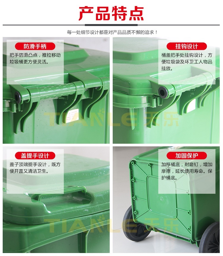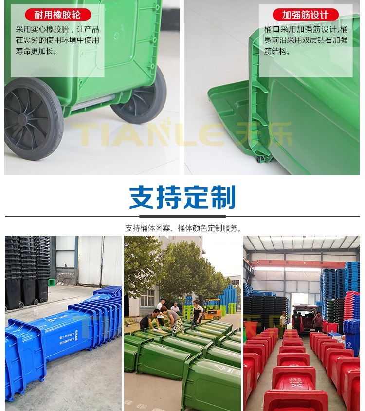 240L、120L、100L、50L、30L塑料垃圾桶、40L、20L雙桶(雙胞胎、干濕)垃圾桶、660L掛車?yán)?、智能垃圾桶、戶外垃圾桶、分類垃圾桶由山東天樂塑料科技有限公司提供,我公司提供桶體圖案、顏色定制服務(wù),歡迎來電咨詢洽談!
