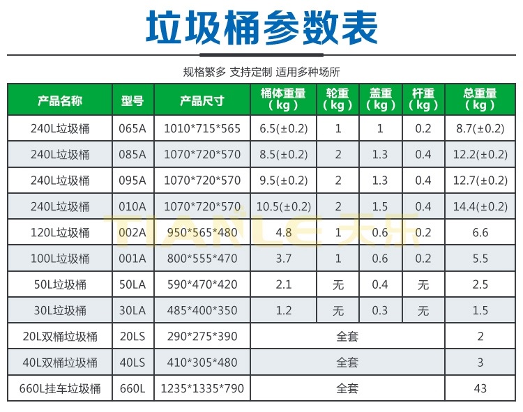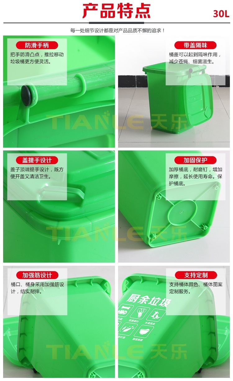 塑料垃圾桶它在現(xiàn)實(shí)生活中是無處不在的一種環(huán)保產(chǎn)品,在中國大約有5億多個(gè)垃圾桶在使用。塑料環(huán)衛(wèi)分類垃圾桶是我公司主營產(chǎn)品之一,為此,山東天樂塑料科技有限公司生產(chǎn)的240L、120L、100L、50L、30L環(huán)衛(wèi)分類垃圾桶;40L、20L雙桶(雙胞胎)垃圾桶;智能垃圾桶;660L掛車?yán)暗认盗挟a(chǎn)品,可以更好助力城市鄉(xiāng)村垃圾分類,幫助解決地?cái)偨?jīng)濟(jì)帶來的城市環(huán)境衛(wèi)生問題。垃圾分類是城市鄉(xiāng)村文明的進(jìn)步,培養(yǎng)垃圾分類的好習(xí)慣,為改善城市鄉(xiāng)村生活環(huán)境作努力,為綠色環(huán)保、循環(huán)利用、持續(xù)發(fā)展作貢獻(xiàn)。垃圾不落地,環(huán)境更美麗!垃圾分一分,城市美十分!