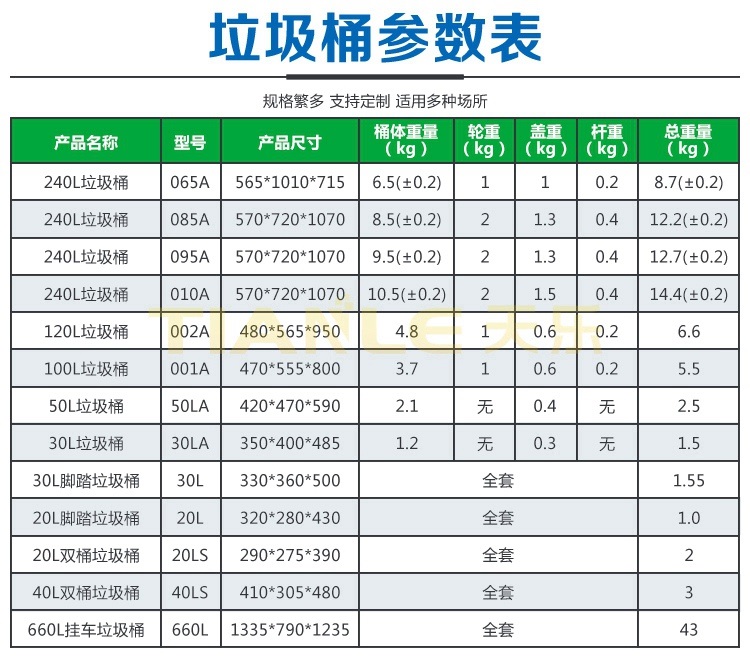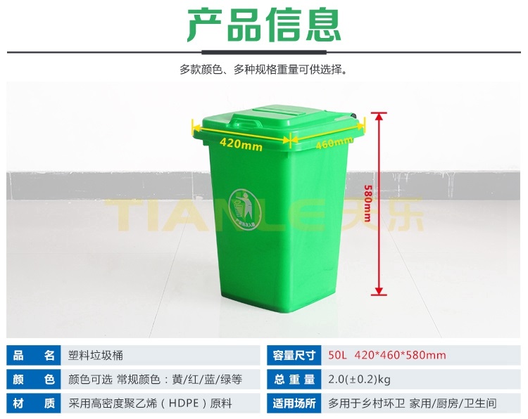 隨著垃圾分類(lèi)在全國(guó)各大城市強(qiáng)制實(shí)施、農(nóng)村人居環(huán)境綜合整治、城鄉(xiāng)清潔工程的實(shí)施以及國(guó)家鼓勵(lì)“地?cái)偨?jīng)濟(jì)”政策,垃圾桶產(chǎn)品將迎來(lái)無(wú)限商機(jī),環(huán)衛(wèi)局、環(huán)保局、城市管理局依據(jù)多年城市環(huán)境治理經(jīng)驗(yàn),相繼會(huì)投入更多的垃圾桶參與環(huán)境衛(wèi)生治理!為此,山東天樂(lè)塑料科技有限公司生產(chǎn)的240L/120L/100L/50L/30L環(huán)衛(wèi)分類(lèi)垃圾桶;40L/20L雙桶(雙胞胎)垃圾桶;智能垃圾桶;660L掛車(chē)?yán)暗认盗挟a(chǎn)品,可以更好助力城市鄉(xiāng)村垃圾分類(lèi)及城鄉(xiāng)生活環(huán)境,幫助解決地?cái)偨?jīng)濟(jì)帶來(lái)的城市環(huán)境衛(wèi)生問(wèn)題。