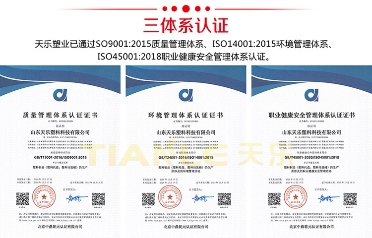 山東天樂塑料科技有限公司是一家集研發(fā),設(shè)計,制造,銷售為一體的大型生產(chǎn)塑料產(chǎn)品企業(yè),公司通過ISO質(zhì)量管理體系、環(huán)境管理體系、職業(yè)健康安全管理體系認(rèn)證,AAA企業(yè)信用等級認(rèn)證。公司擁有大型注塑、吹塑成型設(shè)備十多臺,擁有經(jīng)驗豐富的設(shè)計研發(fā)團(tuán)隊,支持產(chǎn)品定制服務(wù)。主營生產(chǎn)塑料托盤(九腳、雙面吹塑托盤;川字、田字、九腳、雙面注塑托盤)、240L/120L/100L/50L/30L塑料垃圾桶、40L/20L雙胞胎垃圾桶、660L掛車?yán)啊⒅悄芾啊⑺芰现苻D(zhuǎn)箱(筐)、塑料折疊箱(筐)、PP中空板、拉伸纏繞膜等系列產(chǎn)品。
