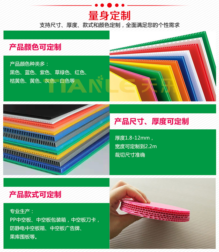 PP中空板是我天樂公司支柱產業(yè)之一,與塑料托盤、環(huán)衛(wèi)分類垃圾桶組成推動天樂公司發(fā)展的三駕馬車,年產量4000余噸。主要有PP中空板、PP中空板包裝箱、PP中空板刀卡、PP防靜電中空板箱、PP中空板廣告牌、果庫圍板、墊板隔板等產品。中空板產品可按照客戶要求定制尺寸、厚度、款式和顏色。產品廣泛應用于建筑行業(yè)、廣告行業(yè)、箱包行業(yè)、瓶罐行業(yè)、農業(yè)、汽配行業(yè)、煙草包裝、工廠內部周轉、展覽展示、節(jié)日工藝品等行業(yè),產品通過SGS環(huán)保認證及歐盟RoHS檢測。