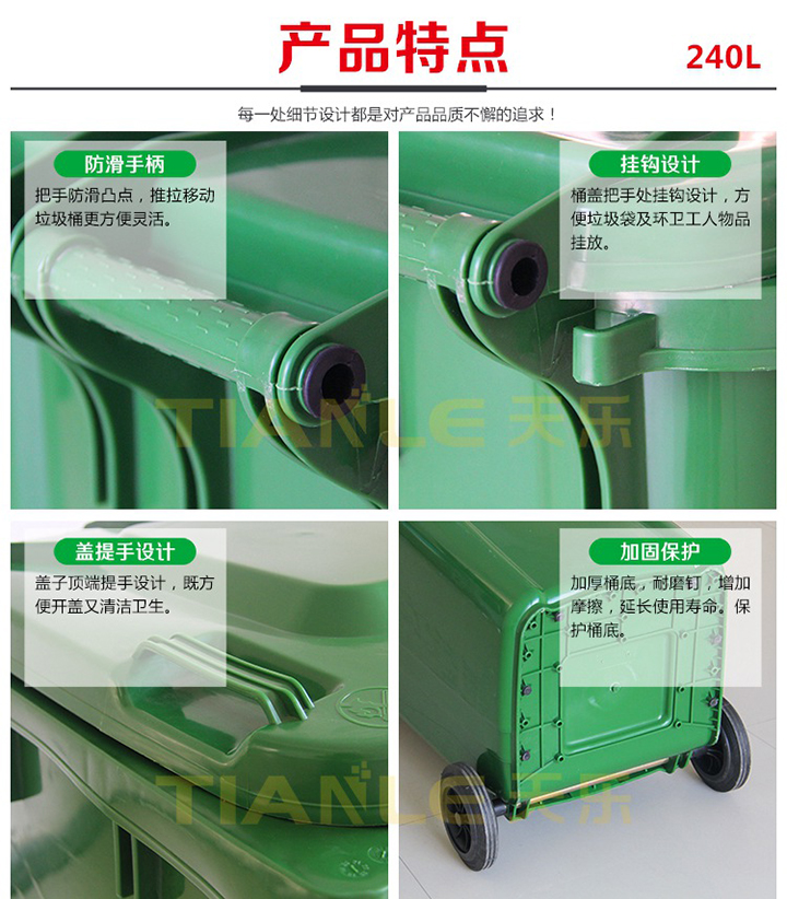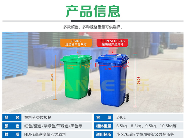 山東天樂塑料科技有限公司坐落于山東省菏澤市巨野縣城東工業(yè)園,緊鄰327國道,地理位置優(yōu)越,交通便利。天樂塑料是一家集研發(fā),設(shè)計(jì),制造,銷售為一體的大型生產(chǎn)塑料產(chǎn)品企業(yè),公司擁有大型注塑、吹塑成型設(shè)備十多臺,擁有經(jīng)驗(yàn)豐富的設(shè)計(jì)研發(fā)團(tuán)隊(duì),可提供產(chǎn)品定制服務(wù)。專業(yè)生產(chǎn)240L分類垃圾桶、120L/100L/50L/30L塑料垃圾桶、40L/20L雙胞胎垃圾桶、660L掛車?yán)?、智能垃圾桶、塑料托盤、塑料周轉(zhuǎn)箱(筐)、塑料折疊箱、PP中空板、拉伸纏繞膜等系列產(chǎn)品。垃圾桶廣泛適用于市政環(huán)衛(wèi)、鄉(xiāng)鎮(zhèn)環(huán)衛(wèi)、城市街道、小區(qū)、物業(yè)、學(xué)校、醫(yī)院、公園、各類公共廣場、餐飲飯店、夜市大排檔、工廠、企業(yè)單位、花園、車站、碼頭、風(fēng)景名勝區(qū)等場所及分類垃圾收集。塑料托盤廣泛應(yīng)用于倉儲物流、電商快遞、食品醫(yī)藥、糧油面粉、煙酒飲料、商場超市、印刷印務(wù)、電子電器、化工化肥、服裝紡織、汽車汽配等行業(yè)。