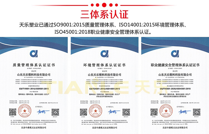 過去的2020年天樂塑業(yè)公司取得了突飛猛進的發(fā)展的同時,生產(chǎn)規(guī)模、產(chǎn)能持續(xù)擴大,企業(yè)管理更為規(guī)范,順利通過ISO質(zhì)量管理、環(huán)境管理、職業(yè)健康安全管理三體系認證及AAA企業(yè)信用等級認證,多次作為塑料托盤生產(chǎn)包裝企業(yè)代表應邀出席托盤行業(yè)、倉儲物流行業(yè)國際會議,推動物流包裝標準化、智能化、綠色化、協(xié)同化、共享化高質(zhì)量發(fā)展。